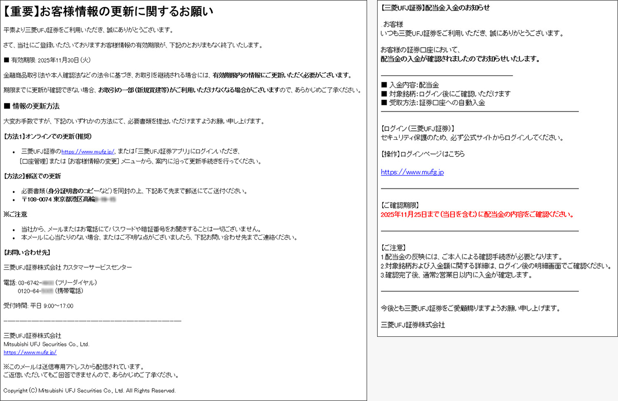 | ・ | メールを受信した際は、必ず発信元のメールアドレスが真正なドメインであることをよくご確認ください。 当社のドメイン一覧はこちらをご確認ください。 |